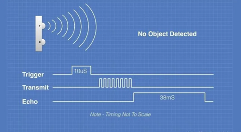 - If the pulse in NOT reflected back then the Echo signal will timeout after 38 mS (38 milliseconds) and return low. This produces a 38 mS pulse that indicates no obstruction within the range of the sensor.