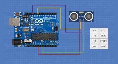 Connecting the HC-SR04 to the Arduino is pretty easy. You’ll need a couple of digital I/O ports and a connection to the Arduino’s 5-Volt and Ground pins.