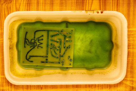 - Now immerse the PCB into the ferric chloride solution to allow the etching process. The process will prompt the reaction between unmasked copper and FeCl3 to expel unwanted copper from the board. It should take about 30 minutes.