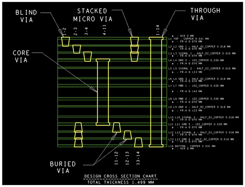 As for the standards applicable to the design of HDI printed circuit boards, the reference is represented by the IPC-2226 standard ("Sectional Design Standard for High Density Interconnect Printed Boards"), which replaces and supersedes the previous IPC-2315 standard ("Design Guide for High Density Interconnects & Microvias "). In addition to providing guidelines for microvia selection, the standard identifies six different types of stackups that can be used for HDI PCB design. The different stackups are divided into categories, from I to VI, with increasing complexity and costs. Each of these categories defines the number and position of each layer in the HDI stackup, and recommendation about the substrate material to be used. Also note how the microvia, as well as in the single mode shown in Figure 1, can be overlapped (occupying the same position) on several adjacent layers. In this case we are talking about "stacked microvia". An example can be seen in Figure 3, where the overlapped microvias occupy layers 1, 2 and 3 of a hypothetical multi-layer printed circuit board consisting of 14 layers.