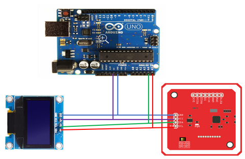 Connect the OLED display and PN532 to Arduino as shown. GND to GND, SDA to A4, SCL to A5, and power the Vcc with 5V.