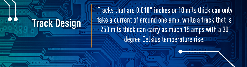 Your board may require multiple nets with different currents, which will determine the net width you need. Using a trace width calculator can help with this step. Thin tracks can only carry so much current. Tracks that are 0.010″ inches or 10 mils thick can only take a current of around one amp, while a track that is 250 mils thick can carry as much 15 amps with a 30 degree Celsius temperature rise.