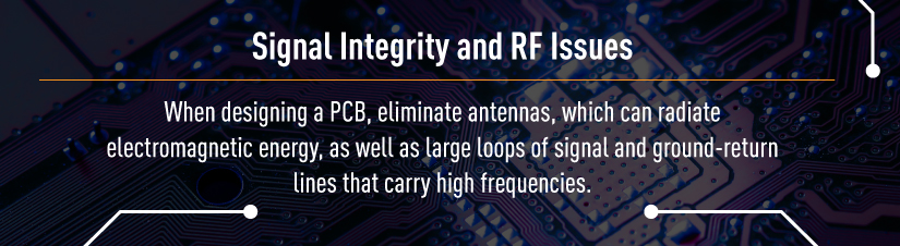 When designing a PCB, eliminate antennas, which can radiate electromagnetic energy, as well as large loops of signal and ground-return lines that carry high frequencies. You must position integrated circuits carefully to achieve short interconnect lines.
