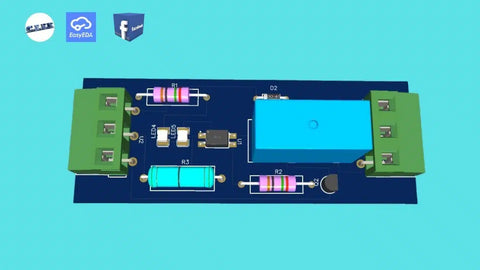 The relay module circuit includes the printed circuit board (PCB) where the relay and several other parts are soldered. The relay module PCB is designed to provide a space for the components and to connect them electrically.