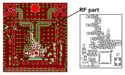 A large number of ground vias should be placed between different layers of the RF part of the PCB. This helps prevent ground current loops from increasing parasitic ground inductance. Vias also help prevent cross-coupling of RF signal lines and other signal lines on the PCB.