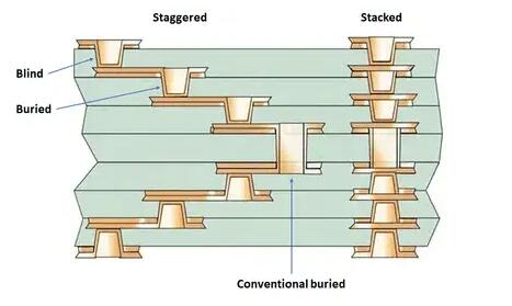 - Stacked microvia - several blind or buried microvia are stacked on top of each other to allow for the inner layers to be connected.