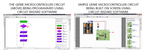 Circuit Wizard also allows a range of GENIE Microcontroller circuits/project boards, to be ‘dragged’ on to the screen, from a menu. Inputs and outputs can be added using further menus. Then, the GENIE microcontroller circuit/project board can be programmed, using Circuit Wizard’s flow charting menu. It can be fully tested/simulated on screen and faults corrected or alterations made. This software is strongly recommended, when designing and manufacturing microcontroller programmable circuits.