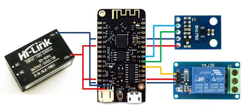 The heart of the ESP32lights control unit is the Wemos L olin32 Lite development board . One of the digital pins of the card is connected to a relay module , which controls the load. Two digital pins, assigned to the first i2c controller of the esp32 chip, are instead connected to the BH1750 brightness sensor . The power supply to all the devices of the control unit is finally supplied by the Hi-Link HLK-PM01 module which converts the 220V AC of the network into 5V DC without the need for external components: