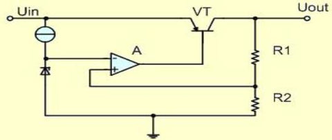 The components used are relatively simple: a series adjustment tube (VT), two voltage divider resistors (R1, R2), an amplifier (A), and a reference voltage (REF). The R1 and R2 resistors are connected to the amplifier, which is connected to the reference voltage. The output of the amplifier (A) is used to drive the adjustment tube (VT), and the input & output of the adjustment tube are connected to the input & output of the circuit.