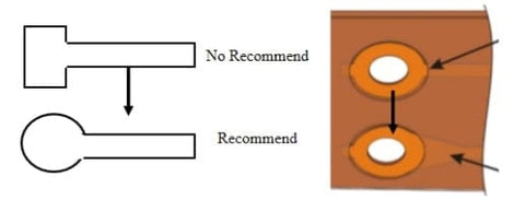 1.2 When the pad meets the electrical requirements, the maximum value should be taken. A smooth transition line is used to connect the pad and the conductor to avoid right angles. The independent pad should be added with a toe to strengthen the supporting effect.
